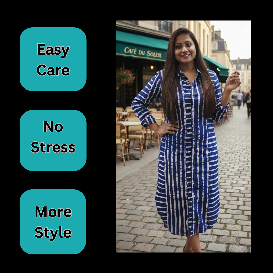 The AMRU Ocean Poise Blue & White Striped Batik Dress is created for the woman who wants to feel fresh, refined, and effortlessly confident without ever looking like she tried too hard.